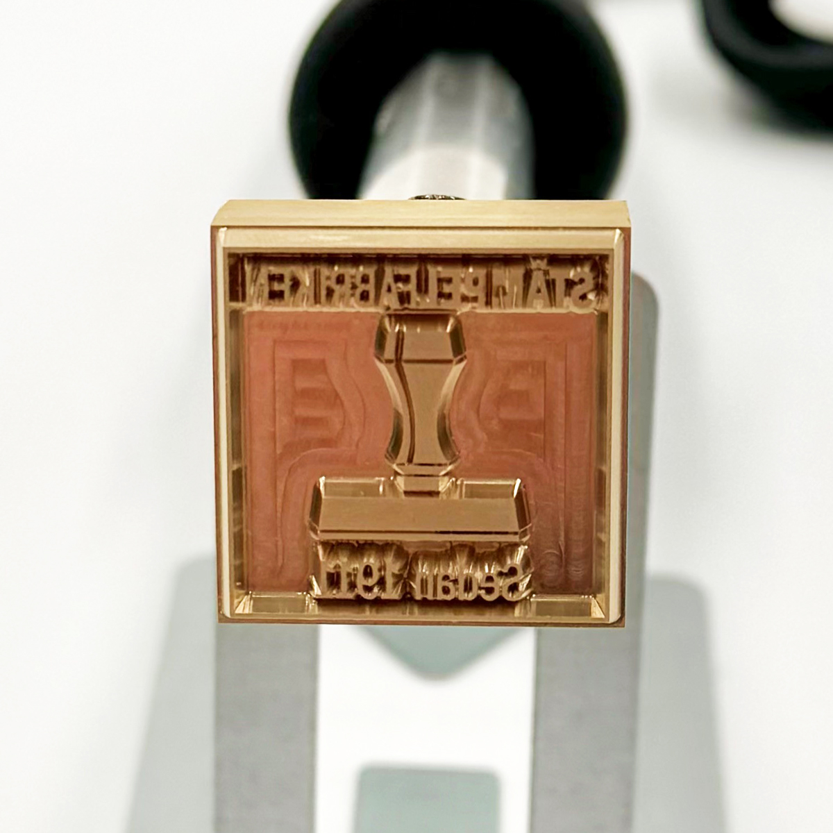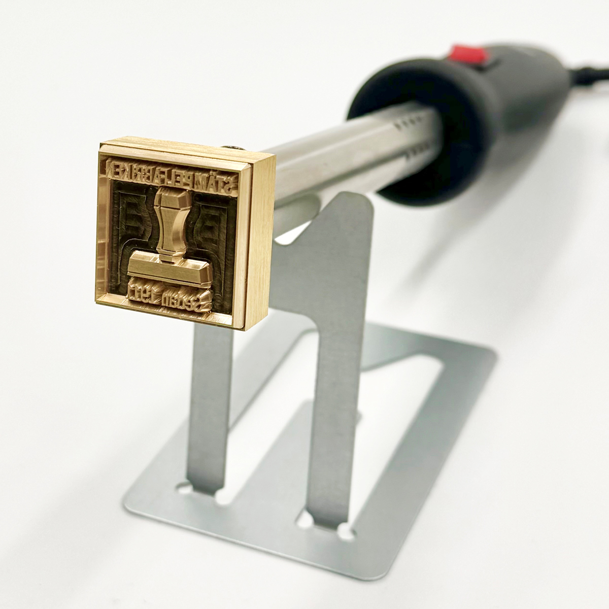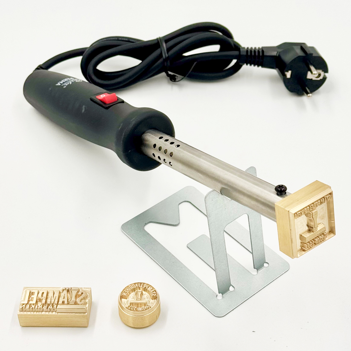 Elektrisk brännstämpel av mycket hög kvalitet med egen logotype eller egen text för märkning på material som trä, läder eller plast. Brännstämpeln levereras komplett med valfritt motiv och med en elektrisk kolv med en effekt som är anpassad till storleken på gravyren. Ett praktiskt stativ i metall ingår även. Perfekt då inte stämpeln används eller när den kyls ner.