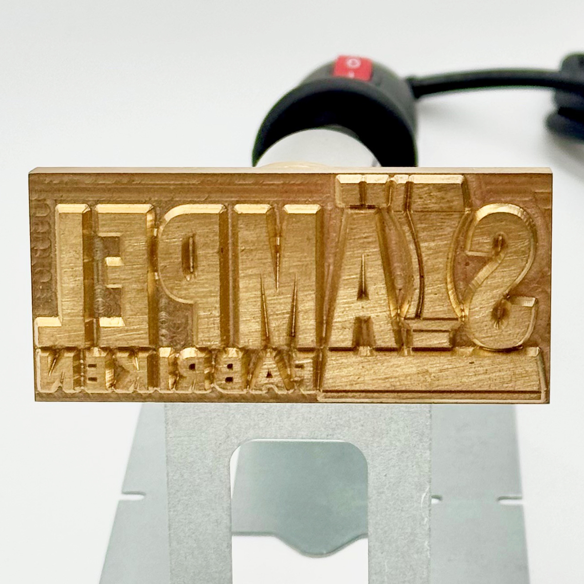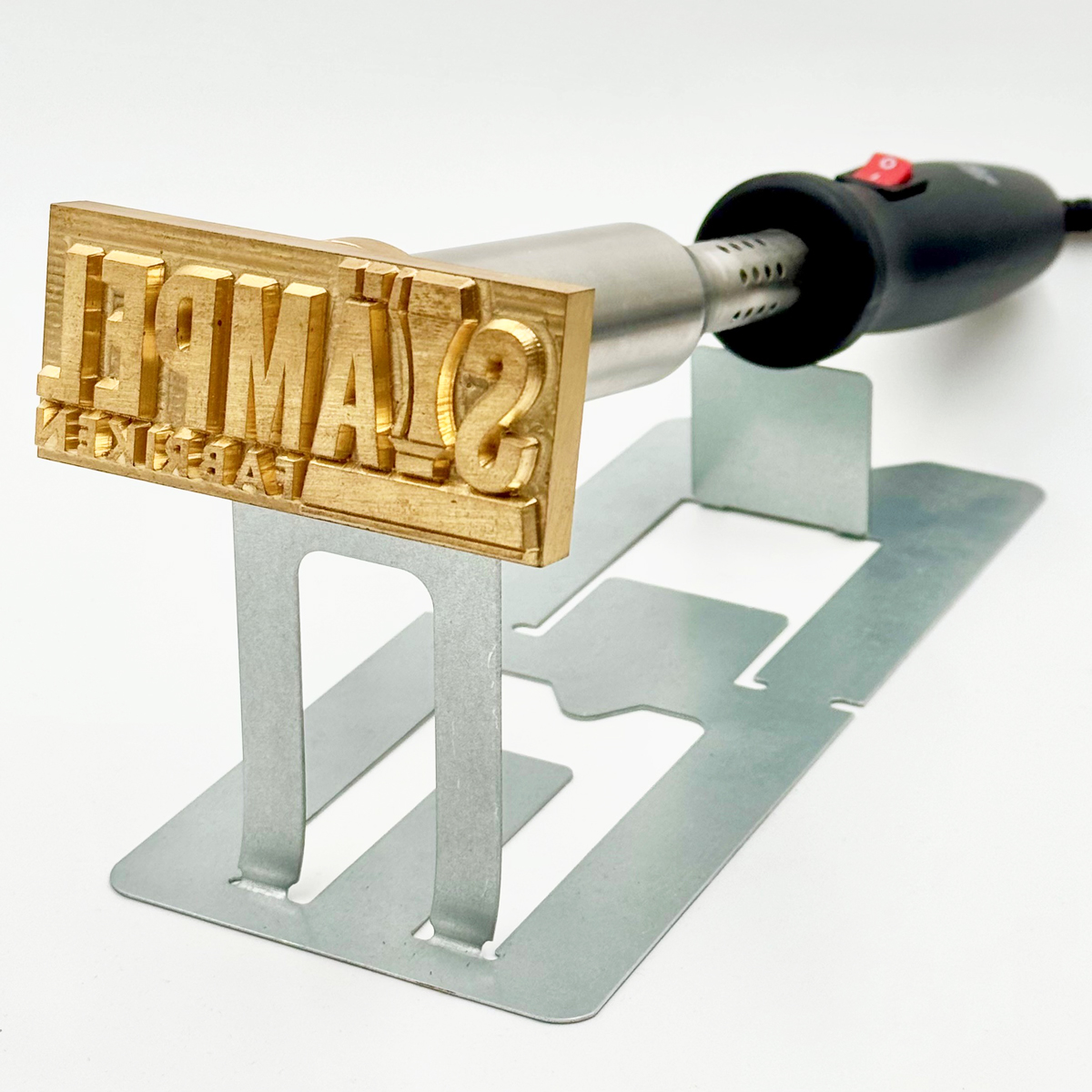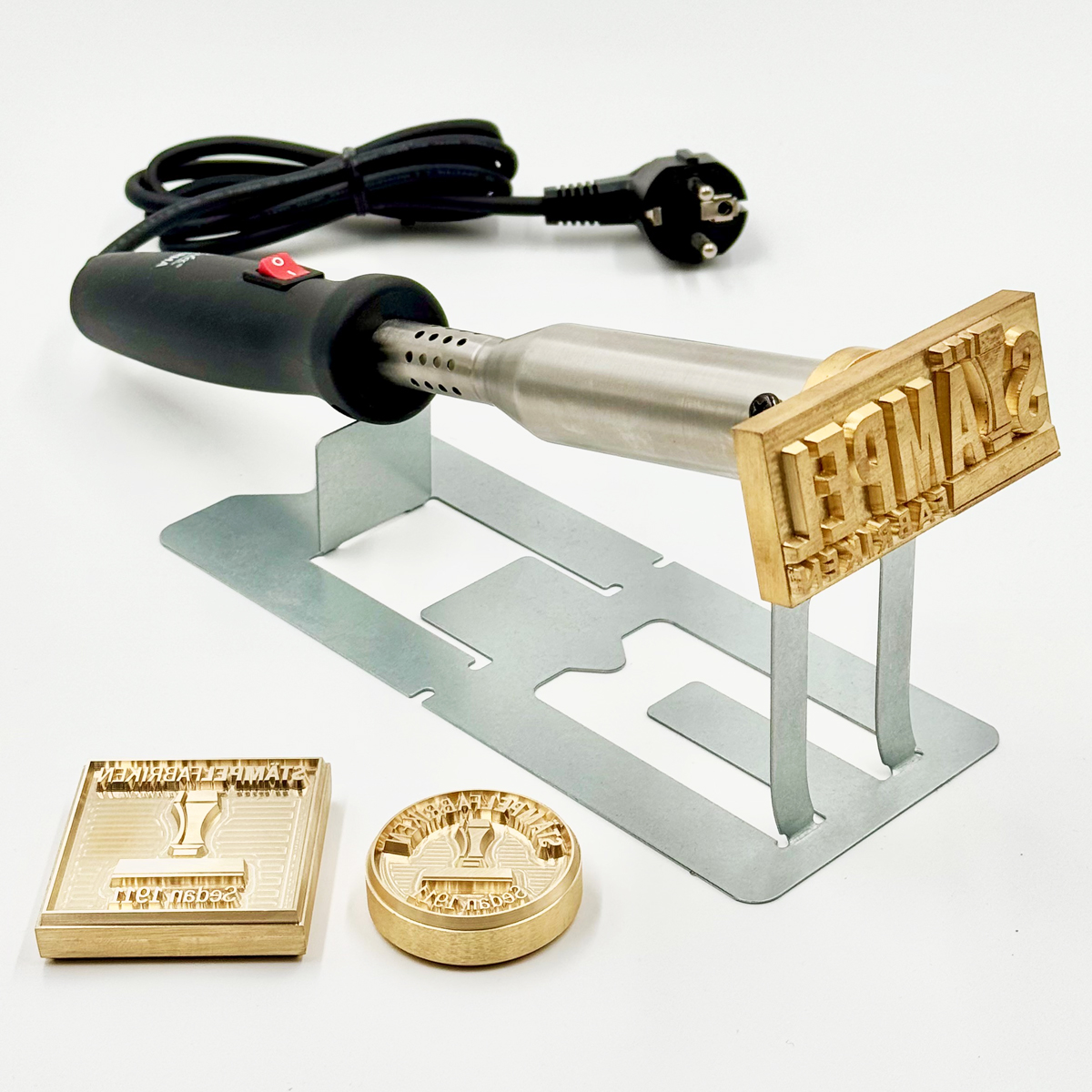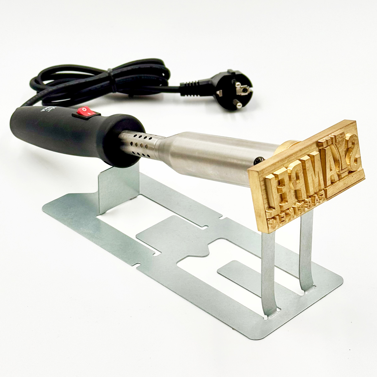 Elektrisk brännstämpel av mycket hög kvalitet med egen logotype eller egen text för märkning på material som trä, läder eller plast. Brännstämpeln levereras komplett med valfritt motiv och med en elektrisk kolv med en effekt som är anpassad till storleken på gravyren. Ett praktiskt stativ i metall ingår även. Perfekt då inte stämpeln används eller när den kyls ner.