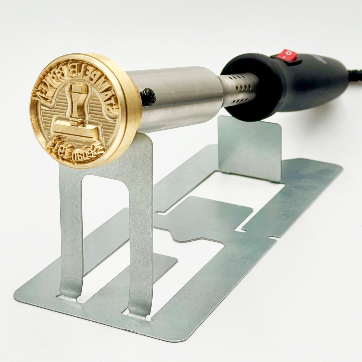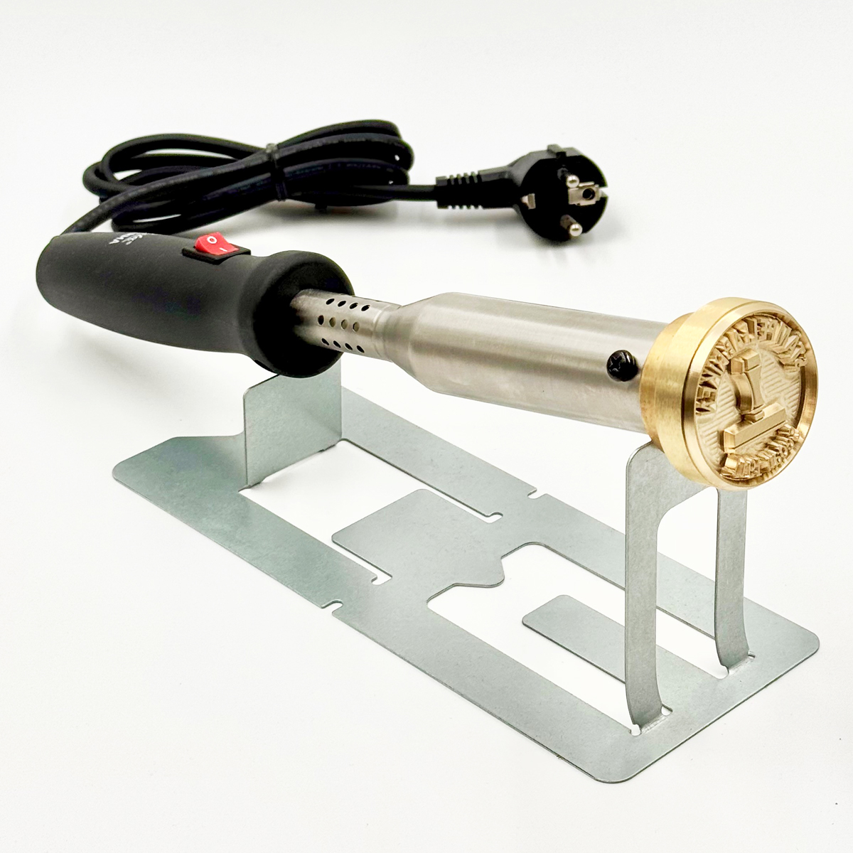 Elektrisk brännstämpel av mycket hög kvalitet med egen logotype eller egen text för märkning på material som trä, läder eller plast. Brännstämpeln levereras komplett med valfritt motiv och med en elektrisk kolv med en effekt som är anpassad till storleken på gravyren. Ett praktiskt stativ i metall ingår även. Perfekt då inte stämpeln används eller när den kyls ner.